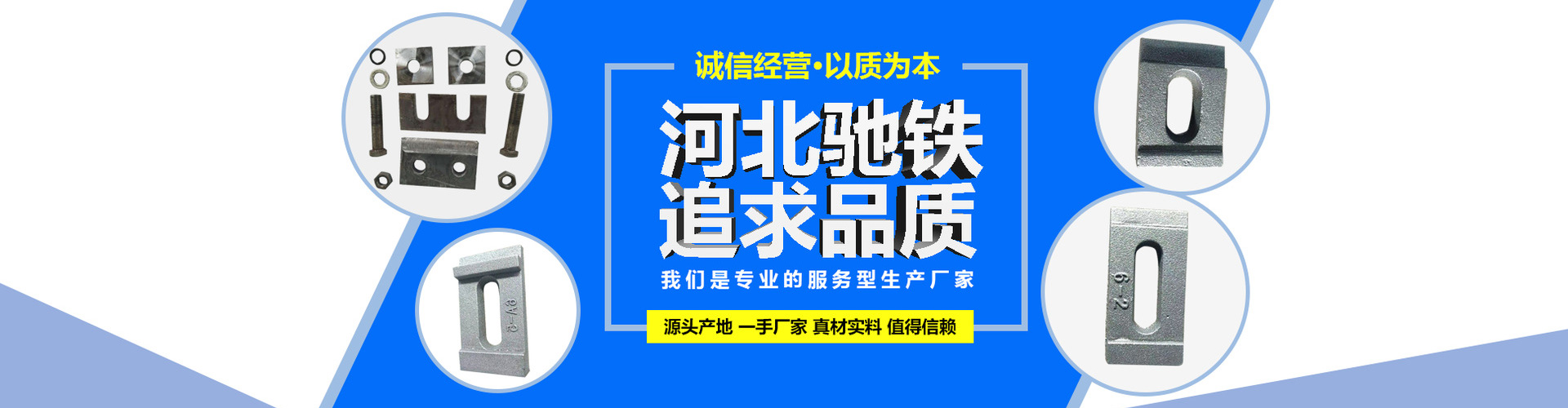 主要產(chǎn)品:鐵路配件、行車配件、工礦配件、魚(yú)尾板、道釘、壓軌器、軌道壓板、軌距拉桿、護(hù)軌扣板、T型螺栓、魚(yú)尾螺栓、彈條、軌距擋板